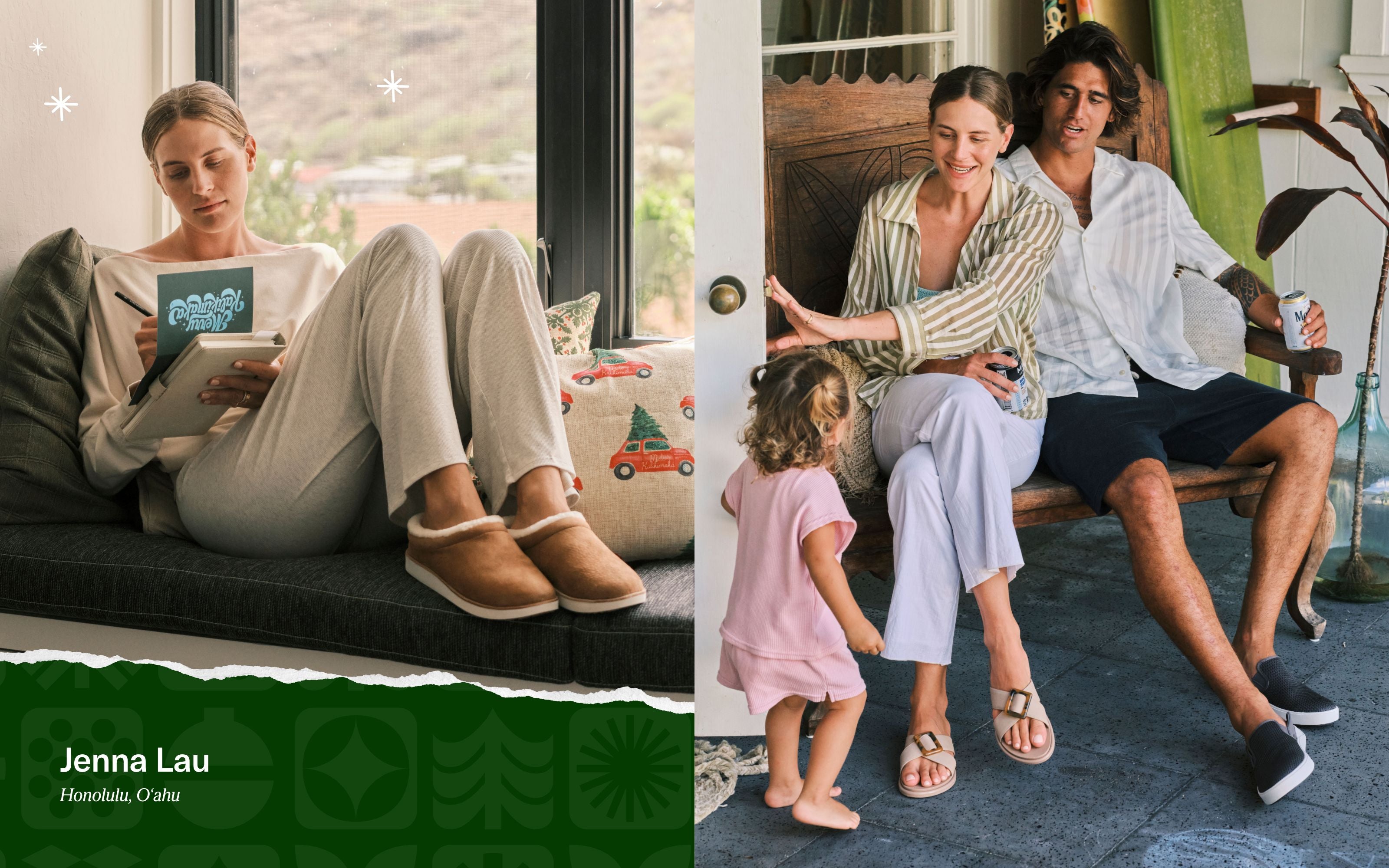Noa Ginella, a self-sufficient homesteader and waterman from the North Shore and Jenna Lau, a style icon from Honolulu, have rounded up their must-have footwear for holiday homewear. Noa has discovered that our Hanohano slipper, with its plush shearling lining, is perfect for cozy nights in, while the Moloā Slipper versatility and indoor-outdoor wear are ideal for moving between the pasture and the lanai.