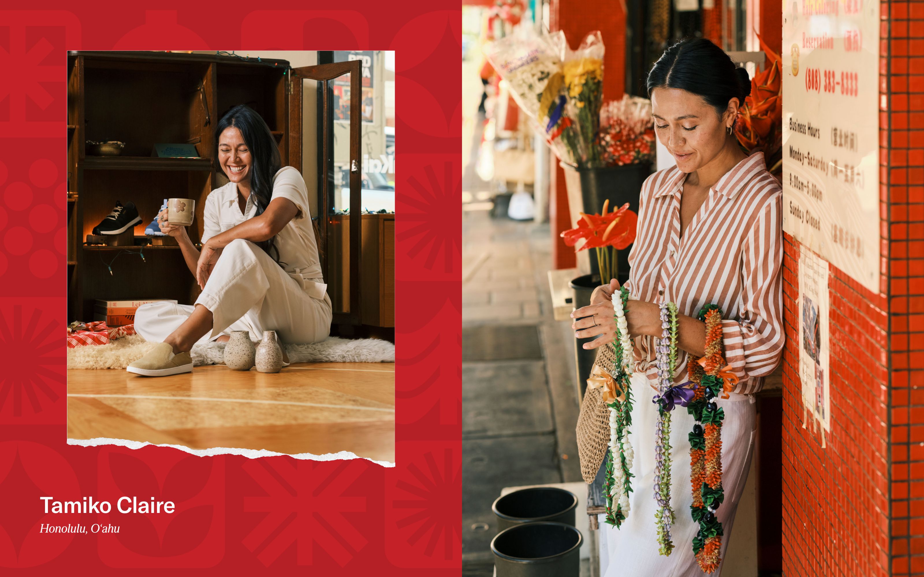A multifaceted ceramicist and business owner, Tamiko Claire does it all. As the founder of her namesake stoneware line, she understands the importance of footwear that can move between the workday studio and a pau hana meet-up with friends. Able to seamlessly transition from office hours to after-hours, Tamiko’s found that Pehuea Luxe, crafted with ultra-smooth suede, keeps pace with even the busiest of schedules. And of course, there’s Mi‘i, our premium women’s leather mule. With a leather design inspired by traditional Polynesian lauhala weaving, Mi‘i adds an artisanal accent to any look, making it easy to dress up if Tamiko decides to head out on the town.