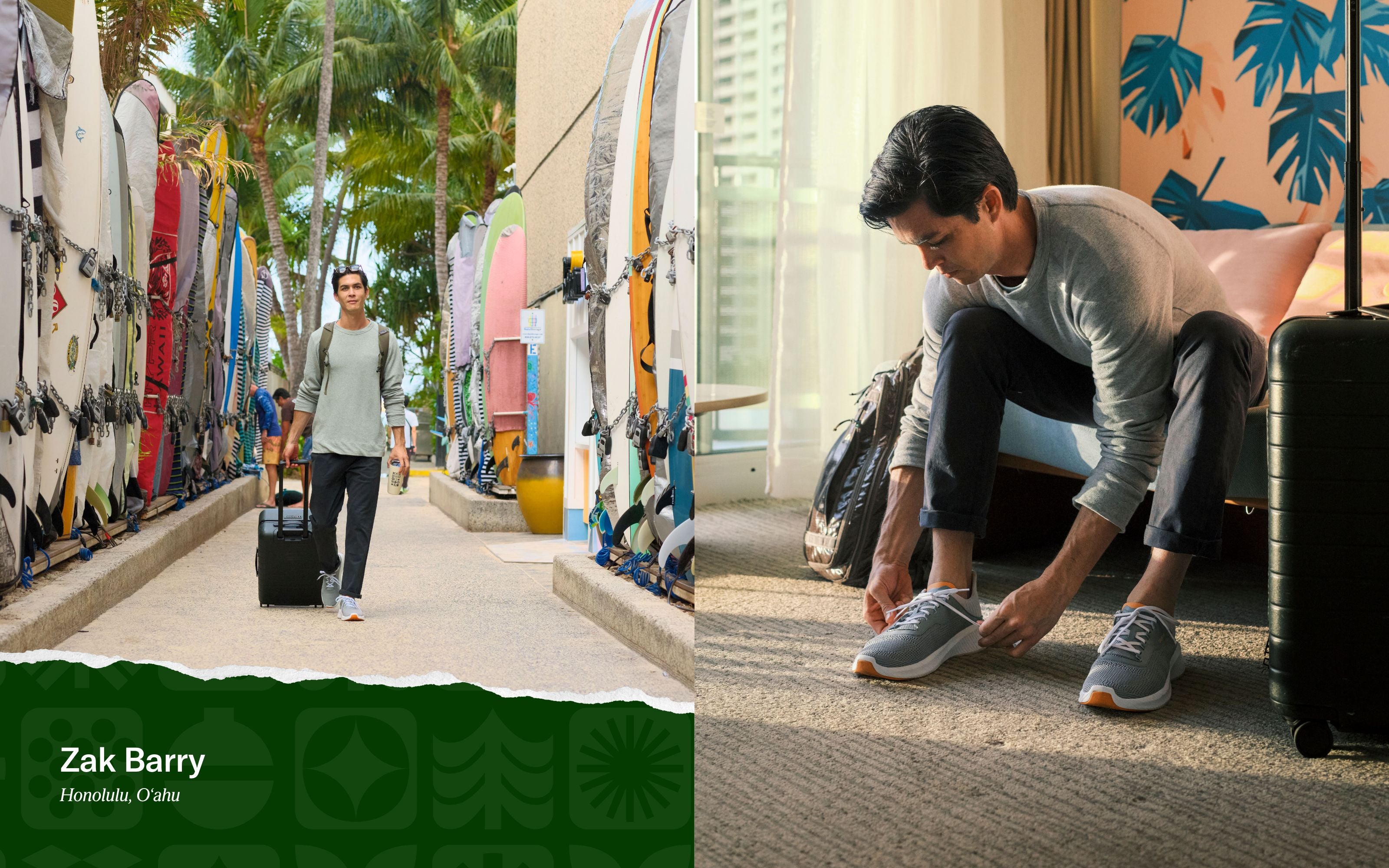 As a small-business owner and co-founder of Banán, a cafe specializing in banana-based frosty treats, Zak Barry knows what it’s like to always be on his feet. Between visiting storefronts in Honolulu and San Francisco and family in Mexico, Zak takes more than a dozen flights a year. Zak’s travel-ready selects offer next-level support and versatility. For the frequent flier in your life, Zak’s found that Island Hopper is as comfortable gliding through jetways as it is navigating urban streets and hidden trails, making it his go-to choice for traveling.